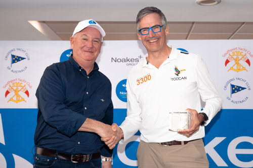 Edward Curry-Hyde (right) at the 2025 Noakes Sydney Gold Coast Yacht Race presentation. Image: CYCA/Ashley Dart